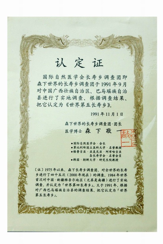 從1991年9月到這次會(huì)議召開(kāi)的十多年來(lái),以森下敬一為團(tuán)長(zhǎng)的日本國(guó)際自然醫(yī)學(xué)會(huì)考察團(tuán),曾多次到巴馬實(shí)地考察。第一次是1991年9月8日至10日,該團(tuán)一行6人到甲篆鄉(xiāng)的弄免、松屯,巴馬鎮(zhèn)的板么、元吉、法福等村屯以及鳳凰鄉(xiāng)對(duì)許多百歲老人進(jìn)行采訪(fǎng)和考察;1992年4月,他又率團(tuán)對(duì)坡利、文錢(qián)、鳳凰、弄京、巴馬、法福等村屯進(jìn)行多方面的考察和采訪(fǎng)。從此他就與巴馬結(jié)下了“百歲”情緣,經(jīng)常到這里來(lái)“走走看看”。